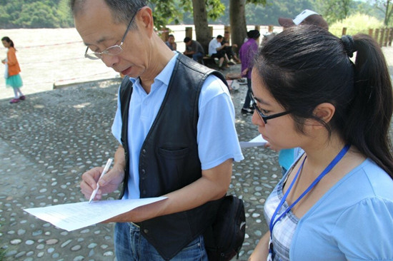 副隊長呂悅帶領的一隊隊員向游客分發(fā)調查問卷,了解他們對生態(tài)文明建設和中國夢的看法。