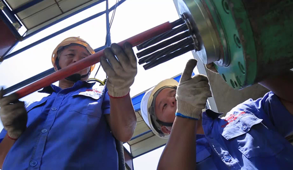 徐露平(右)研制的“鋼絞線自動穿束機(jī)”